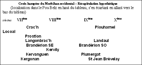 Les indications fournies par l’analyse de nos douze stèles (en fait treize modèles de croix hampées puisque celle de Brandérion en compte deux) ne sont pas toutes fiables, et bien des présomptions comblent les lacunes. Qu’il soit permis cependant de dresser un tableau récapitulatif.