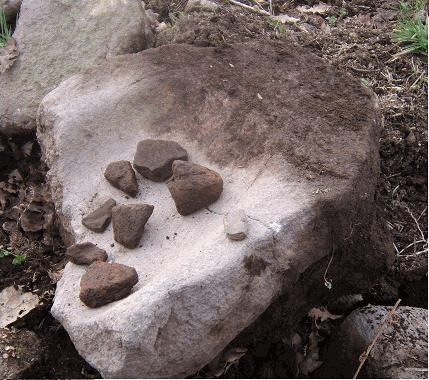 4 - Meule dormante (Pl II, 2) sur le site, la surface claire délavée se trouvait hors sol, la partie terreuse encastrée dans le sol labouré, la céramique trouvée sur place donne l’échelle  |