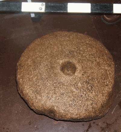 Hypothèse de reconstitution du moulin à bras à partir de la meule dormante circulaire trouvée sur le site