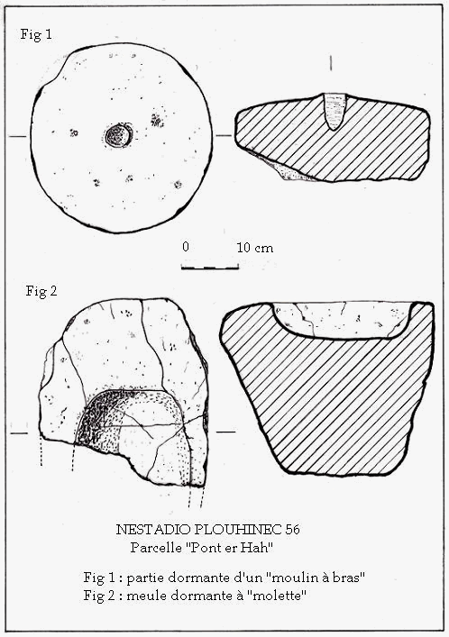 Implanté en bordure immédiate de la rivière d’Etel en Plouhinec, le site fut découvert fortuitement au printemps 2006 dans une parcelle de terre fraîchement emblavée et parsemée de nombreux cailloux de tailles diverses en surface. L’inventeur de cette découverte adhérent de la SAHPL fut à juste titre intrigué par cette parcelle, son intuition et sa curiosité ont été récompensées. La parcelle sous culture présentait de nombreuses pierres en surface suite à un charruage profond dont une meule dormante très « creusée » à demi enfouie dans la terre arable et mélangée à d’autres cailloux de dimensions conséquentes. L’association s’est chargée de sauver ce mobilier, en effet, le granit constituant cette meule présente de nombreuses fissures anciennes bien prononcées, un second charruage l’aurait très certainement brisé. Ce sauvetage a été l’occasion d’une prospection de surface de la parcelle qui a recélé un mobilier riche et varié :